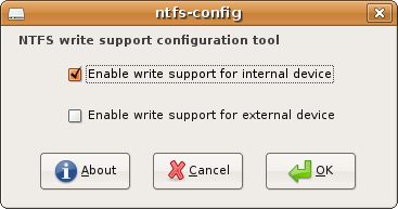 Sau khi quá trình cài đặt kết thúc bạn, bạn chọn menu Applications > System Tools > NTFS Configuration Tool. Sẽ có một màn hình yêu cầu bạn nhập mật khẩu của bạn vào, rồi đến cửa sổ cấu hình rất đơn giản sau:
