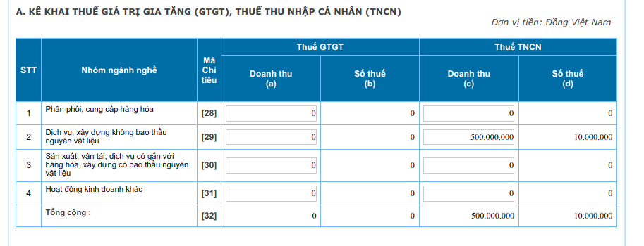 Ở phần kê khai, do không chịu thuế GTGT, không xuất hóa đơn GTGT thì cứ mặc định chỉ khai doanh thu cho phần doanh thu thuế TNCN
