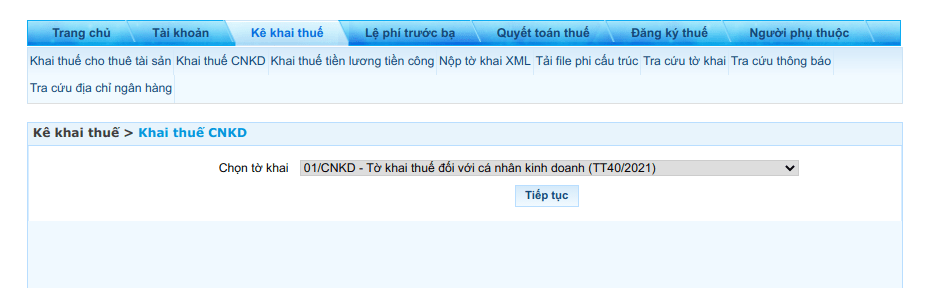 Vào mục: Kê khai thuế -> Khai thuế CNKD -> Tờ khai TT40/2021